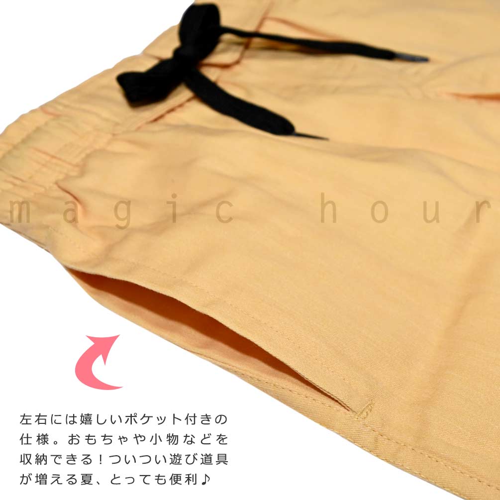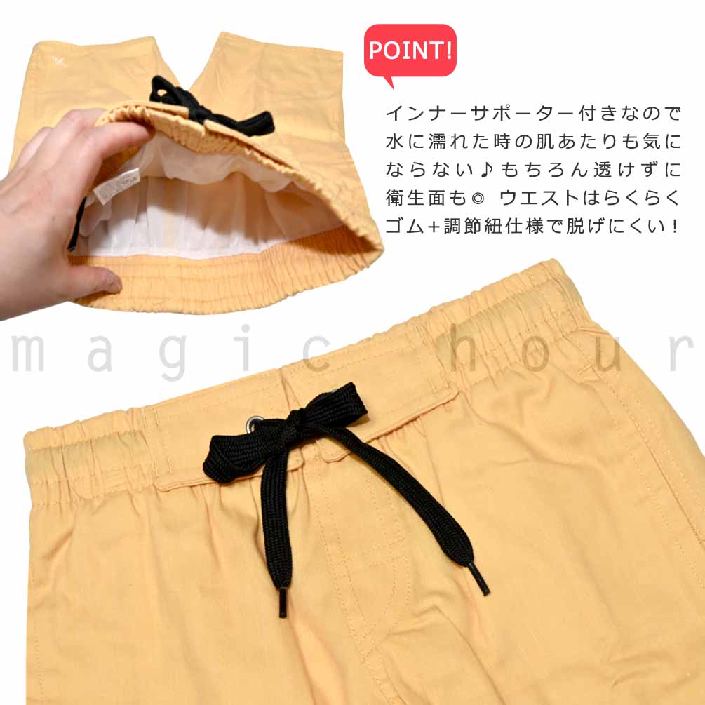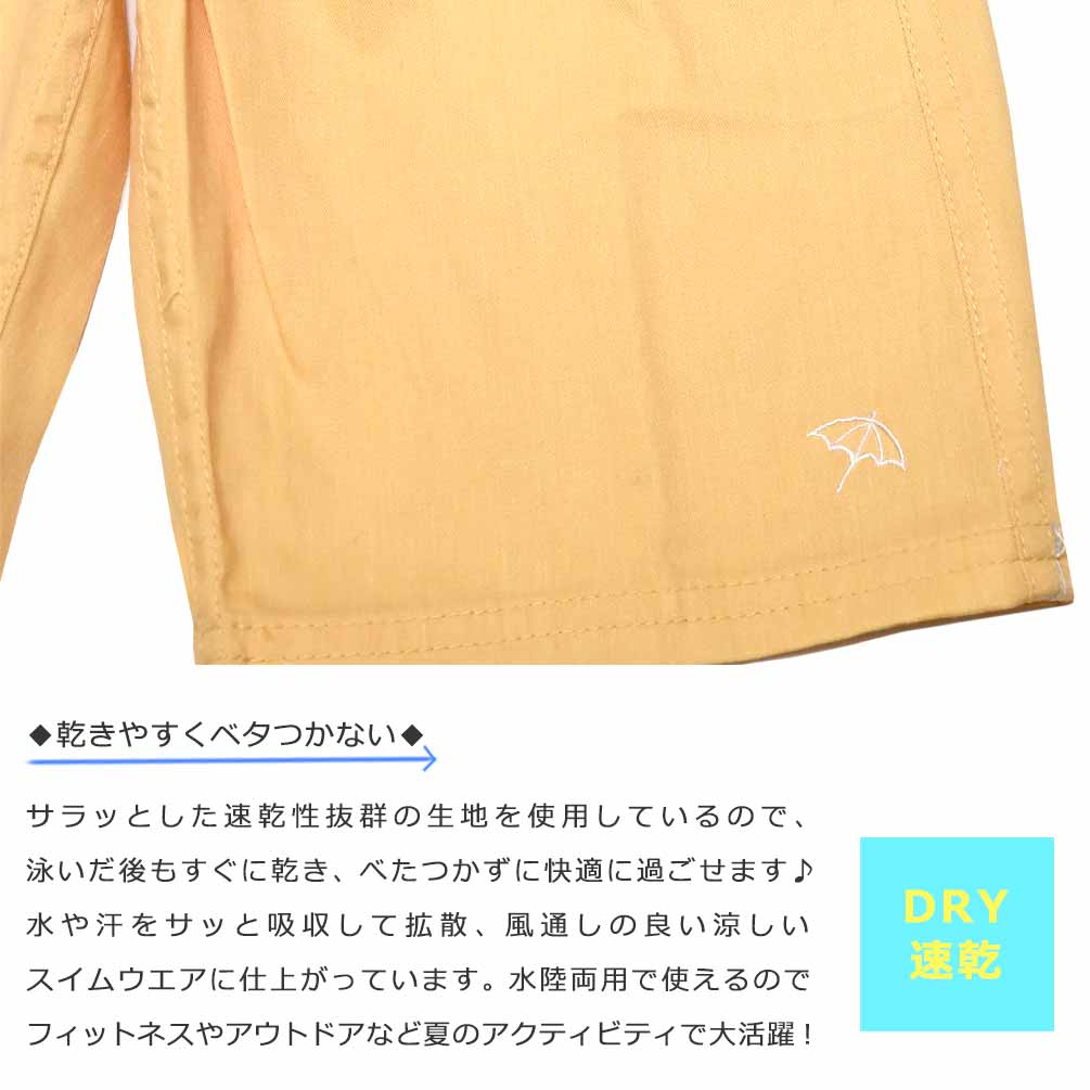 海水浴、プールやアウトドアに使える子どもサイズのお洒落なサーフパンツ♪ ポケット付き・ウエスト調節紐・インナーサポーター内臓で機能性も◎ さらっとした手触りの良い柔らかな速乾素材で動きやすくべたつかず快適に過ごせる! 脱げにくく動きやすいウエストゴム仕様で思いっきり遊べます! |